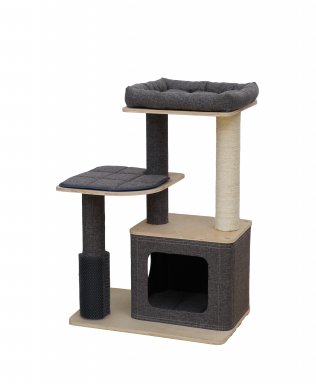 Voor katten is een krabpaal erg belangrijk om hun nagels te verzorgen en territorium te markeren. De EBI Tapei is gemaakt uit berkenmultiplex en is bekleed met een donkergrijze meubelstof. De robuuste krabpaal is omwikkeld met sterk sisal. De Tapei heeft een kattenhuisje met twee openingen, deze is zeer geschikt als schuil- en rustplaats voor jouw kat, maar ook als speelhuisje! Het comfortabele mandje bovenop kan zowel dienen als uitkijkplaats en als slaapplaats. Een van de palen is voorzien een groomer, zodat de kat zichzelf op elk moment kan verzorgen.