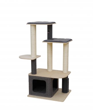 Voor katten is een krabpaal erg belangrijk om hun nagels te verzorgen en territorium te markeren. De EBI Toledo is gemaakt uit berkenmultiplex en is bekleed met een donkergrijze meubelstof. De Toledo heeft drie robuuste krabpalen omwikkeld met sterk sisal. Daarnaast heeft Toledo een kattenhuisje met twee openingen, deze is zeer geschikt als schuil- en rustplaats voor jouw kat, maar ook als speelhuisje! Een van de palen is voorzien van een groomer, zodat de kat zichzelf op elk moment kan verzorgen. Last but not least, is er een speelmuisje in een van de palen verstopt, waarmee je kat veel plezier zal hebben!